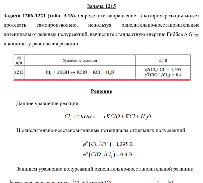 Задачи 1206-1221 (табл. 3.16). Определите направление, в котором реакция может протекать самопроизвольно, используя окислительно-восстановительные потенциалы отдельных полуреаций, вычислите стандартную энергию Гиббса ΔrG0298 и константу равновесия реакции..