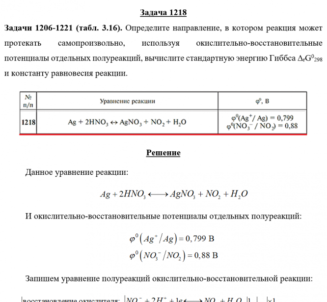 Задачи 1206-1221 (табл. 3.16). Определите направление, в котором реакция может протекать самопроизвольно, используя окислительно-восстановительные потенциалы отдельных полуреаций, вычислите стандартную энергию Гиббса ΔrG0298 и константу равновесия реакции.