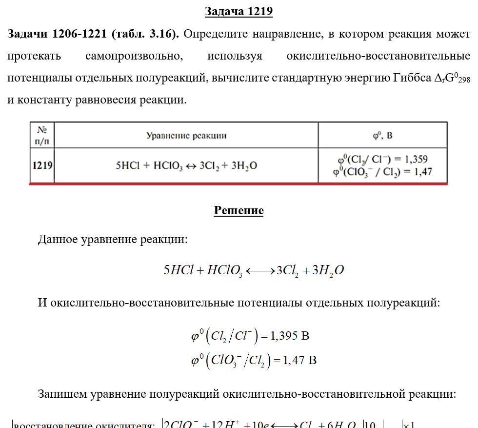 Задача 1219 - Определите направление, в котором реакция может протекать самопроизвольно, используя окислительно-восстановительные потенциалы отдельных полуреаций, вычислите стандартную энергию Гиббса ΔrG0298 и константу равновесия реакции.