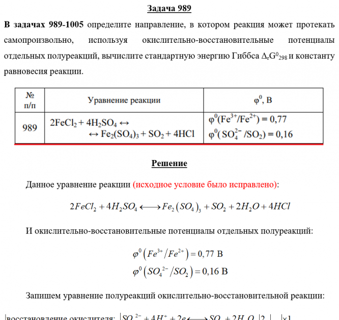 Задача 989 - определите направление, в котором реакция может протекать самопроизвольно, используя окислительно-восстановительные потенциалы отдельных полуреакций, вычислите стандартную энергию Гиббса ΔrG0298 и константу равновесия реакции.