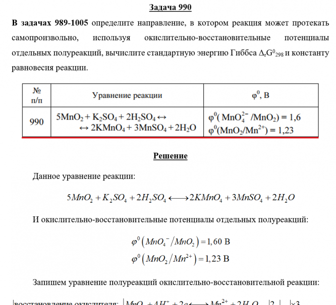 Задача 990 - определите направление, в котором реакция может протекать самопроизвольно, используя окислительно-восстановительные потенциалы отдельных полуреакций, вычислите стандартную энергию Гиббса ΔrG0298 и константу равновесия реакции.