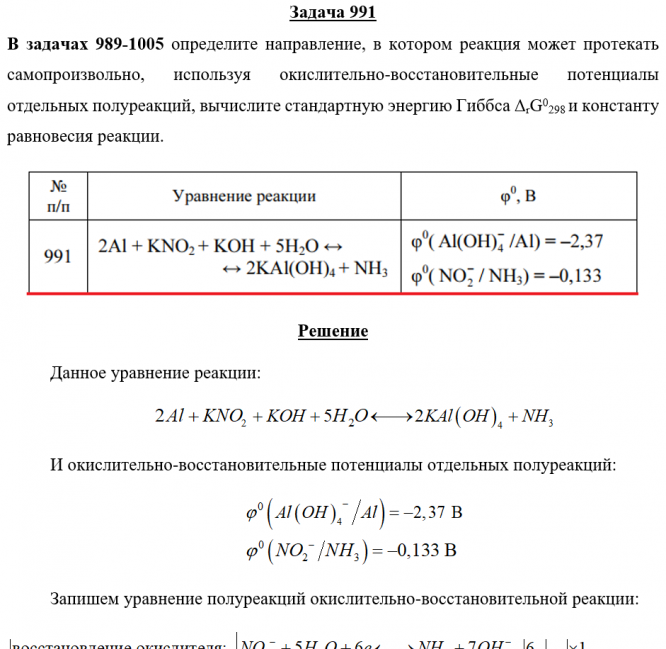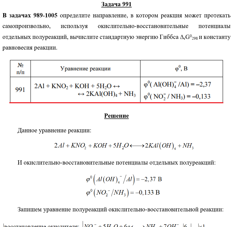 Задача 991 - определите направление, в котором реакция может протекать самопроизвольно, используя окислительно-восстановительные потенциалы отдельных полуреакций, вычислите стандартную энергию Гиббса ΔrG0298 и константу равновесия реакции.