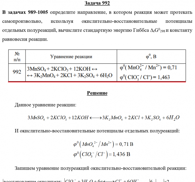 Задача 992 - определите направление, в котором реакция может протекать самопроизвольно, используя окислительно-восстановительные потенциалы отдельных полуреакций, вычислите стандартную энергию Гиббса ΔrG0298 и константу равновесия реакции.