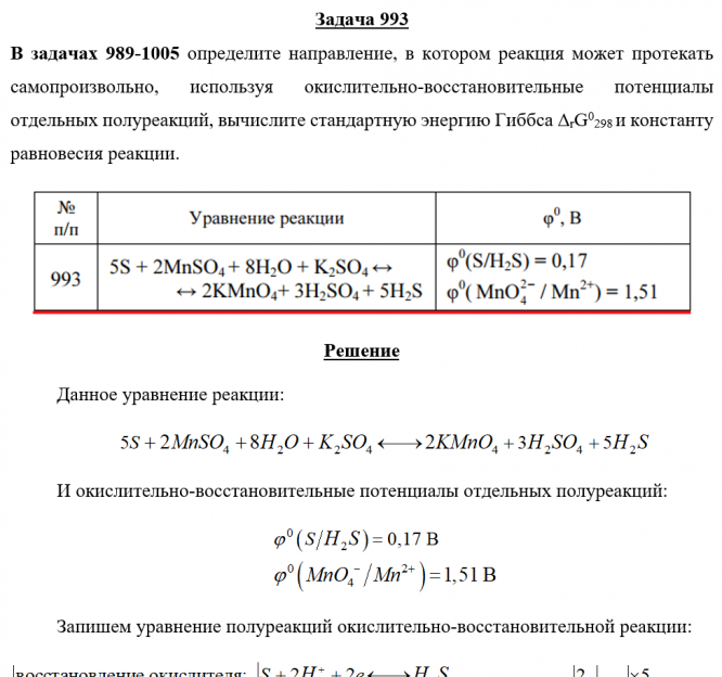 Задача 993 - определите направление, в котором реакция может протекать самопроизвольно, используя окислительно-восстановительные потенциалы отдельных полуреакций, вычислите стандартную энергию Гиббса ΔrG0298 и константу равновесия реакции.