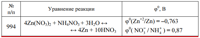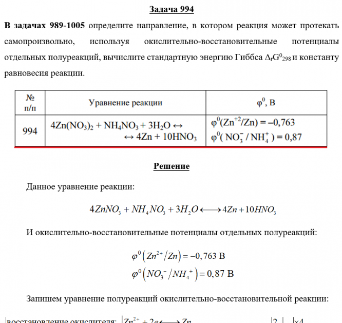 Задача 994 - определите направление, в котором реакция может протекать самопроизвольно, используя окислительно-восстановительные потенциалы отдельных полуреакций, вычислите стандартную энергию Гиббса ΔrG0298 и константу равновесия реакции.