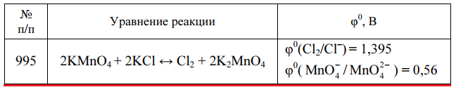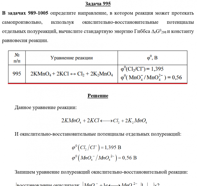 Задача 995 - определите направление, в котором реакция может протекать самопроизвольно, используя окислительно-восстановительные потенциалы отдельных полуреакций, вычислите стандартную энергию Гиббса ΔrG0298 и константу равновесия реакции.