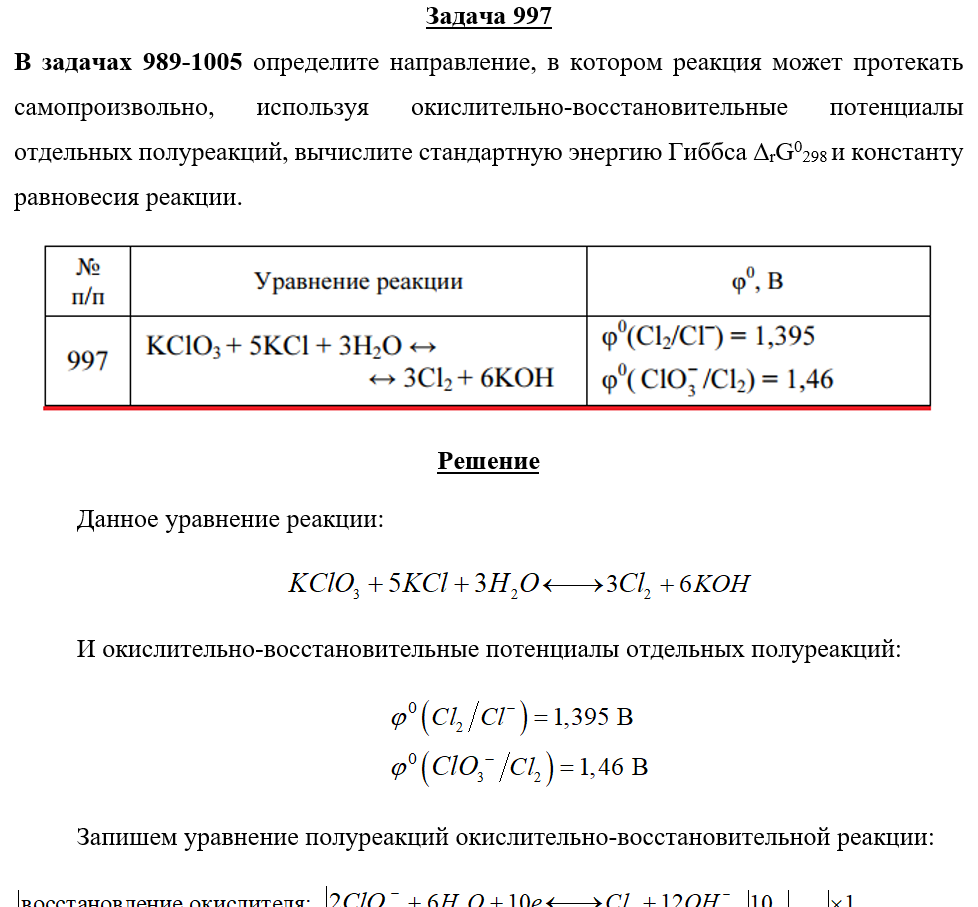 Задача 997 - определите направление, в котором реакция может протекать самопроизвольно, используя окислительно-восстановительные потенциалы отдельных полуреакций, вычислите стандартную энергию Гиббса ΔrG0298 и константу равновесия реакции.