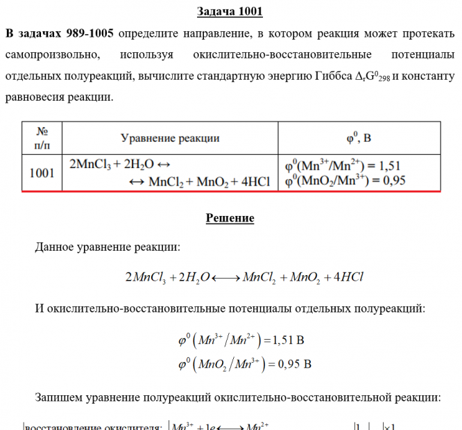 Задача 1001 - определите направление, в котором реакция может протекать самопроизвольно, используя окислительно-восстановительные потенциалы отдельных полуреакций, вычислите стандартную энергию Гиббса ΔrG0298 и константу равновесия реакции.
