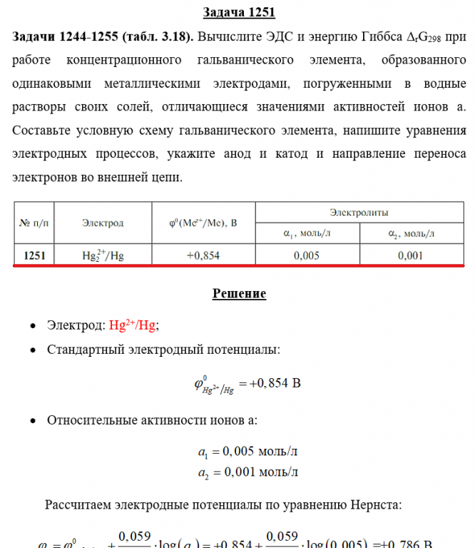 Для студентов по предмету ХимияЗадача 1251 - Вычислите ЭДС и энергию Гиббса ΔrG298 при работе концентрационного гальванического элемента, образованного одинаковыми металлическими элЗадача 1251 - Вычислите ЭДС и энергию Гиббса ΔrG298 при работе концентрационного гальванического элемента, образованного одинаковыми металлическими эл