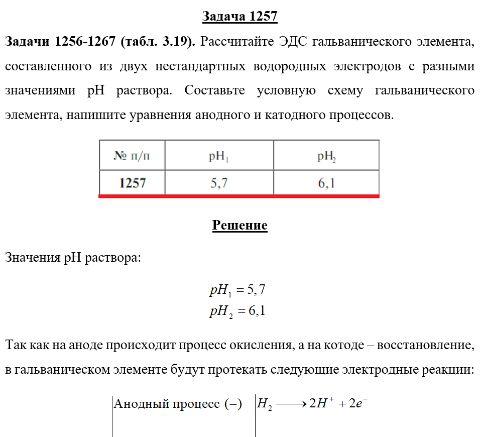 Задача 1257 - Рассчитайте ЭДС гальванического элемента, составленного из двух нестандартных водородных электродов с разными значениями рН раствора. Составьте условную схему гальванического элемента, напишите уравнения анодного и катодного процессов.