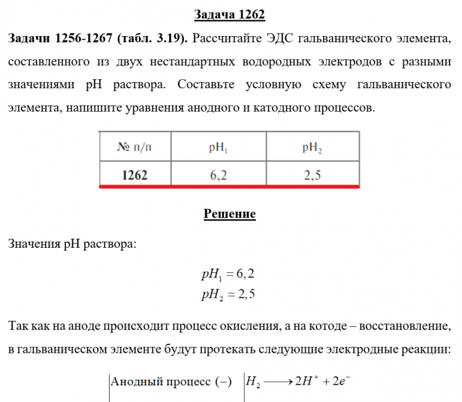 Задача 1262 - Рассчитайте ЭДС гальванического элемента, составленного из двух нестандартных водородных электродов с разными значениями рН раствора. Составьте условную схему гальванического элемента, напишите уравнения анодного и катодного процессов.