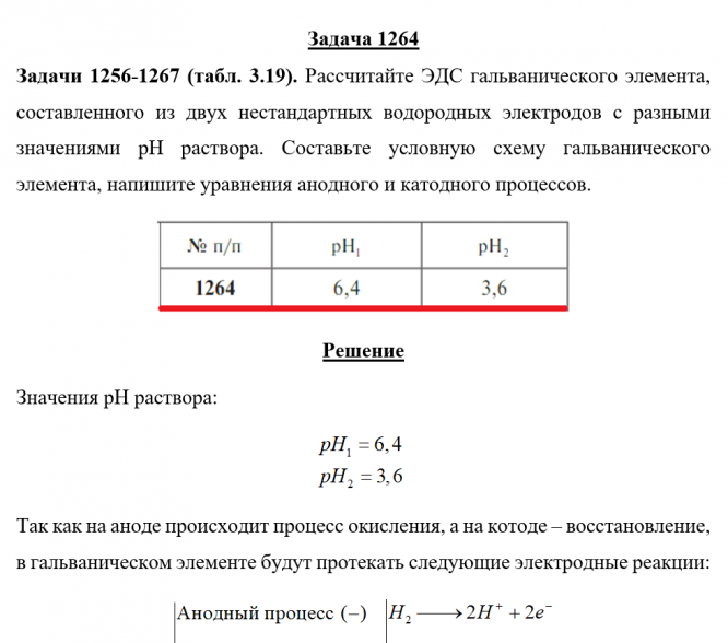 Задача 1264 - Рассчитайте ЭДС гальванического элемента, составленного из двух нестандартных водородных электродов с разными значениями рН раствора. Составьте условную схему гальванического элемента, напишите уравнения анодного и катодного процессов.