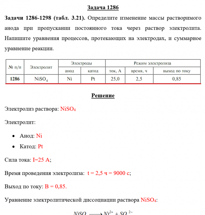 Задача 1286 - Определите изменение массы растворимого анода при пропускании постоянного тока через раствор электролита. На-пишите уравнения процессов, протекающих на электродах, и суммарное уравнение реакции.