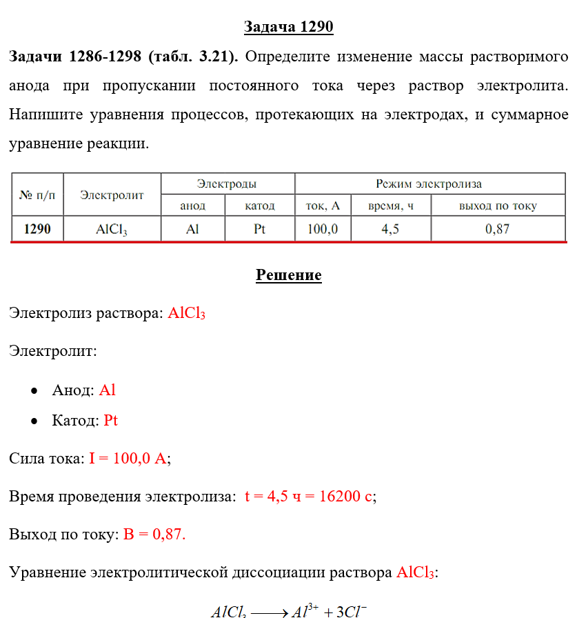 Задача 1290 - Определите изменение массы растворимого анода при пропускании постоянного тока через раствор электролита. На-пишите уравнения процессов, протекающих на электродах, и суммарное уравнение реакции.