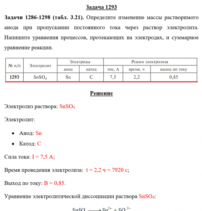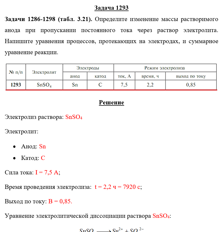 Задача 1293 - Определите изменение массы растворимого анода при пропускании постоянного тока через раствор электролита. На-пишите уравнения процессов, протекающих на электродах, и суммарное уравнение реакции.