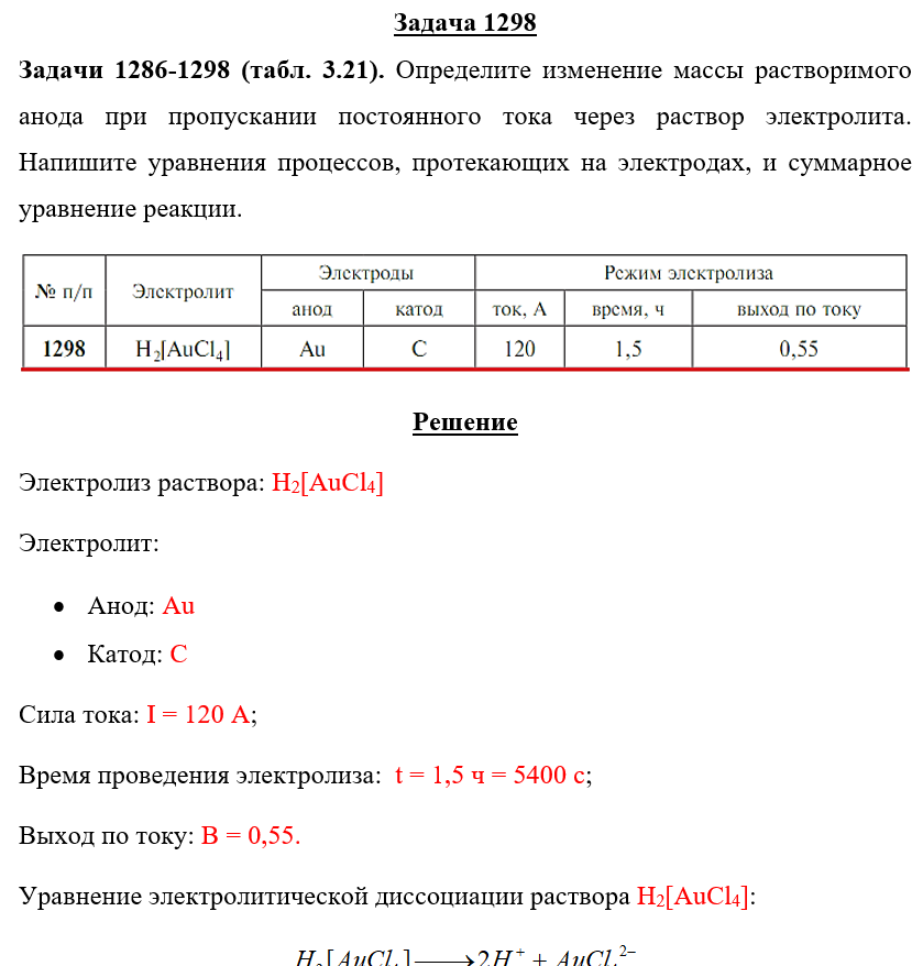 Задача 1298 - Определите изменение массы растворимого анода при пропускании постоянного тока через раствор электролита. На-пишите уравнения процессов, протекающих на электродах, и суммарное уравнение реакции.