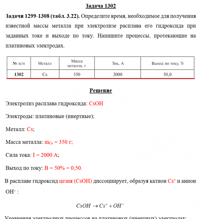 Задачи 1299-1308 (табл. 3.22). Определите время, необходимое для получения известной массы металла при электролизе расплава его гидроксида при заданных токе и выходе по току. Напишите процессы, протекающие на платиновых электродах.
