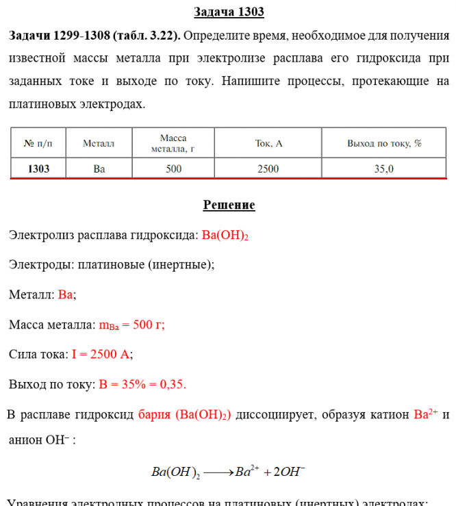 Задача 1303 - Определите время, необходимое для получения известной массы металла при электролизе расплава его гидроксида при заданных токе и выходе по току. Напишите процессы, протекающие на платиновых электродах.