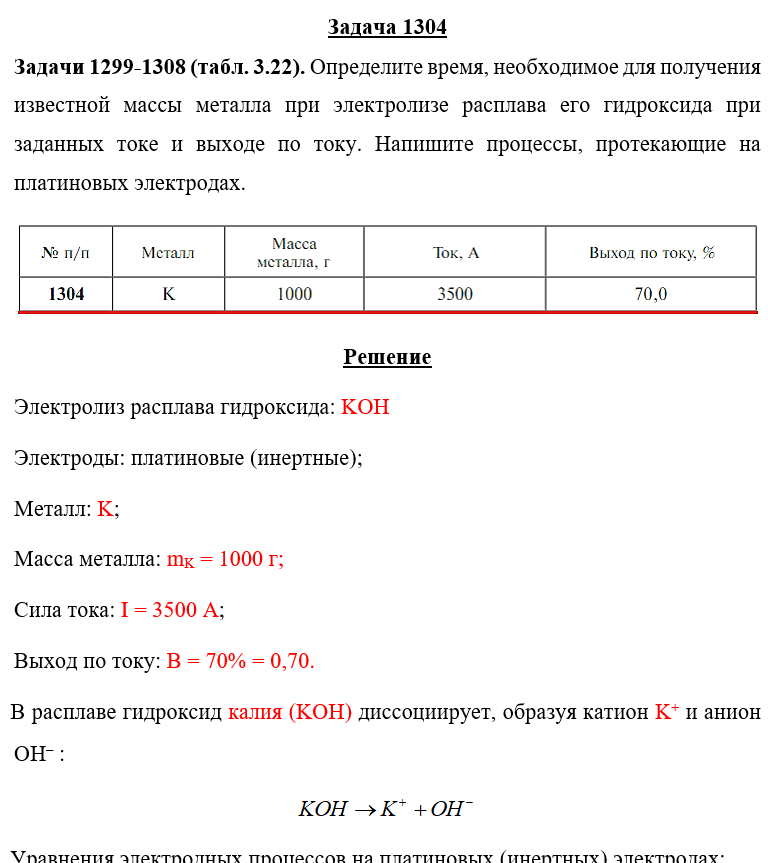Задачи 1299-1308 (табл. 3.22). Определите время, необходимое для получения известной массы металла при электролизе расплава его гидроксида при заданных токе и выходе по току. Напишите процессы, протекающие на платиновых электродах..