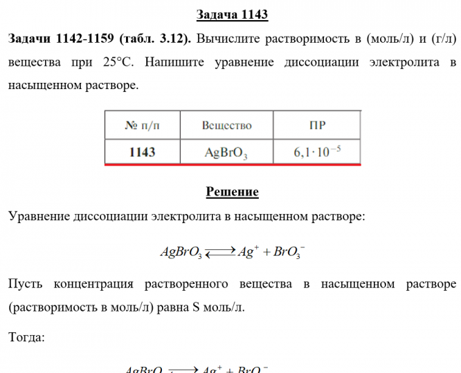 Главная » Учебные материалы » Химия » Решения задач » Несколько классов/семестров » Номер 1143 » Задача 1143 - Вычислите растворимость в (моль/л) и (г/л) вещества при 25°С. Напишите уравнение диссоциации электролита в насыщенном растворе.