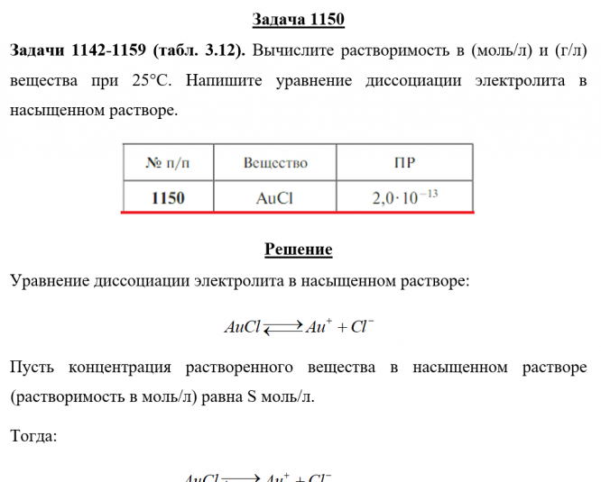 Главная » Учебные материалы » Химия » Решения задач » Несколько классов/семестров » Номер 1150 » Задача 1150 - Вычислите растворимость в (моль/л) и (г/л) вещества при 25°С. Напишите уравнение диссоциации электролита в насыщенном растворе.
