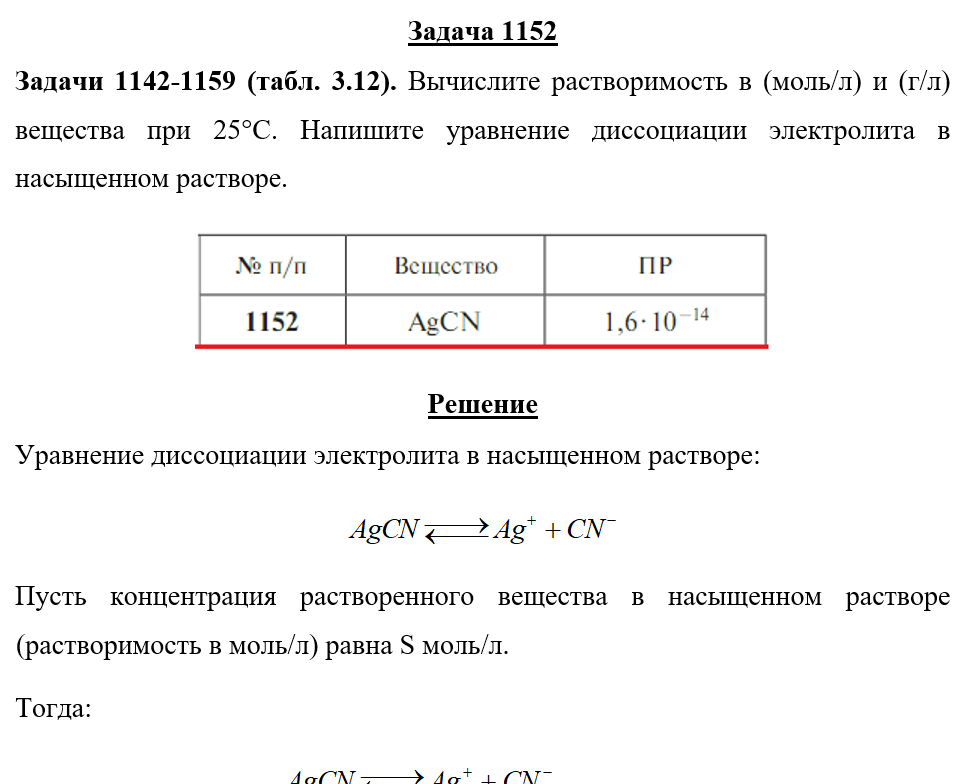 Для студентов по предмету ХимияЗадача 1152 - Вычислите растворимость в (моль/л) и (г/л) вещества при 25°С. Напишите уравнение диссоциации электролита в насыщенном растворе.Задача 1152 - Вычислите растворимость в (моль/л) и (г/л) вещества при 25°С. Напишите уравнение диссоциации электролита в насыщенном растворе.