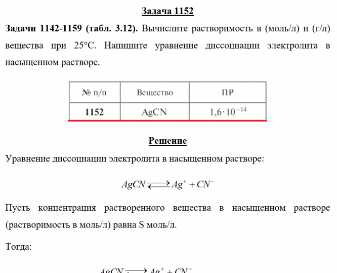 Главная » Учебные материалы » Химия » Решения задач » Несколько классов/семестров » Номер 1152 » Задача 1152 - Вычислите растворимость в (моль/л) и (г/л) вещества при 25°С. Напишите уравнение диссоциации электролита в насыщенном растворе.