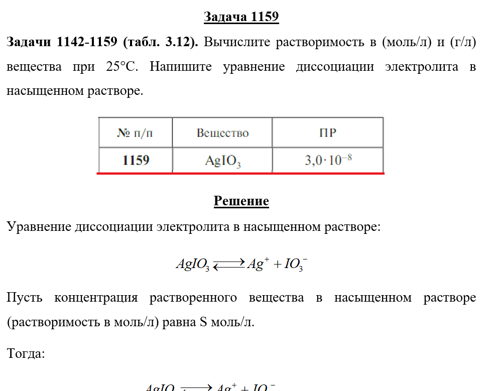 Задача 1159 - Вычислите растворимость в (моль/л) и (г/л) вещества при 25°С. Напишите уравнение диссоциации электролита в насыщенном растворе.