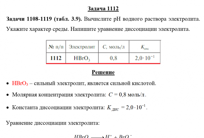 Задачи 1108-1119 (табл. 3.9). Вычислите pH водного раствора электролита. Укажите характер среды. Напишите уравнение диссоциации электролита..