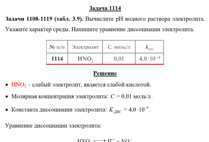 Задача 1114 - Вычислите pH водного раствора электролита. Укажите характер среды. Напишите уравнение диссоциации электролита.