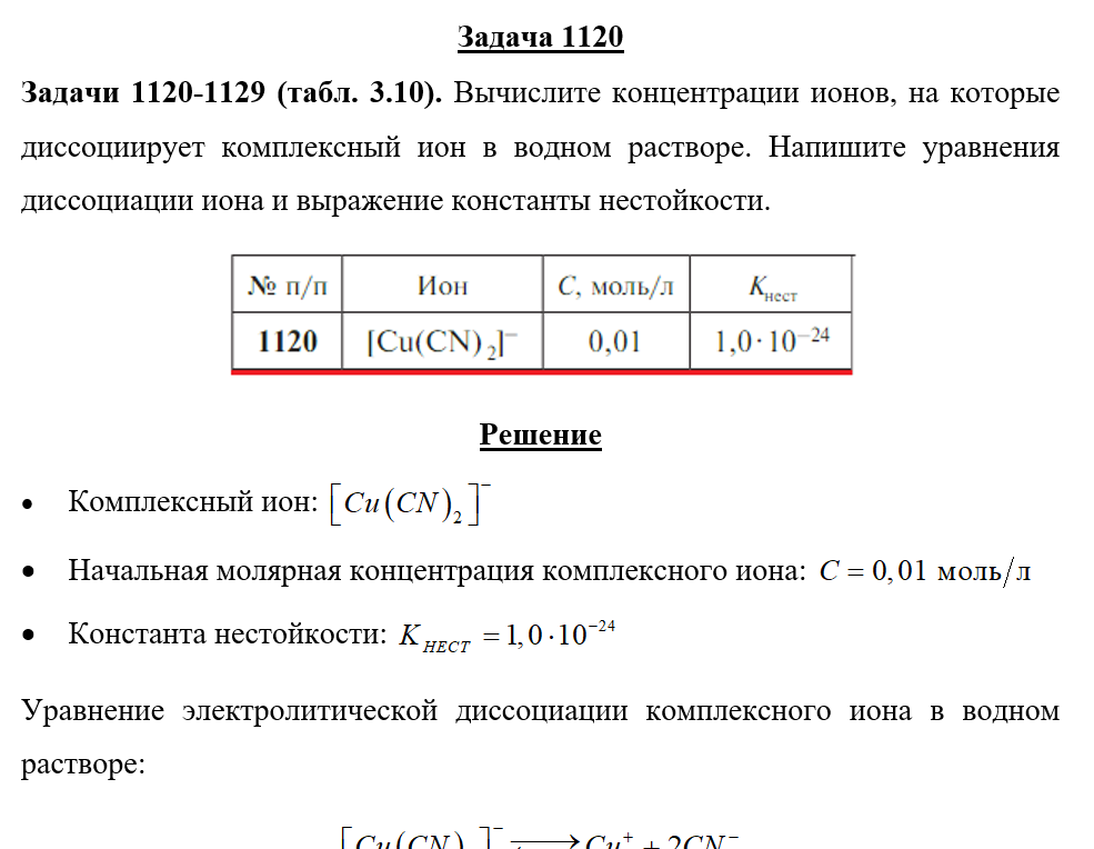 Задачи 1120-1129 (табл. 3.10). Вычислите концентрации ионов, на которые диссоциирует комплексный ион в водном растворе. Напишите уравнения диссоциации иона и выражение константы нестойкости.