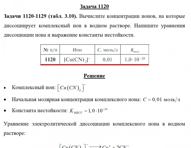 Задачи 1120-1129 (табл. 3.10). Вычислите концентрации ионов, на которые диссоциирует комплексный ион в водном растворе. Напишите уравнения диссоциации иона и выражение константы нестойкости..