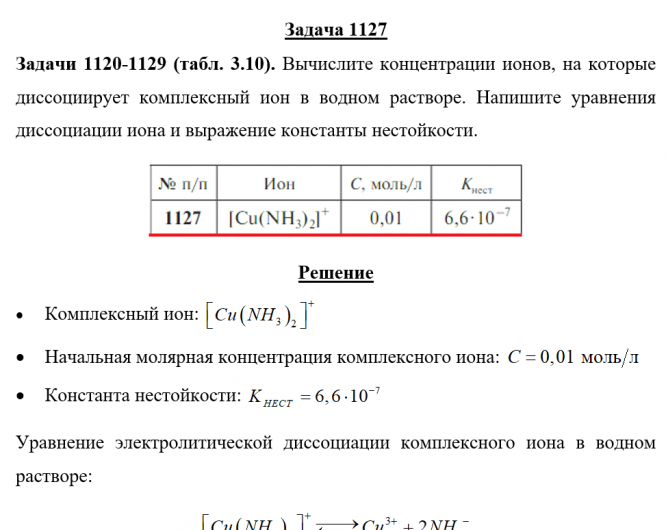 Задачи 1120-1129 (табл. 3.10). Вычислите концентрации ионов, на которые диссоциирует комплексный ион в водном растворе. Напишите уравнения диссоциации иона и выражение константы нестойкости.