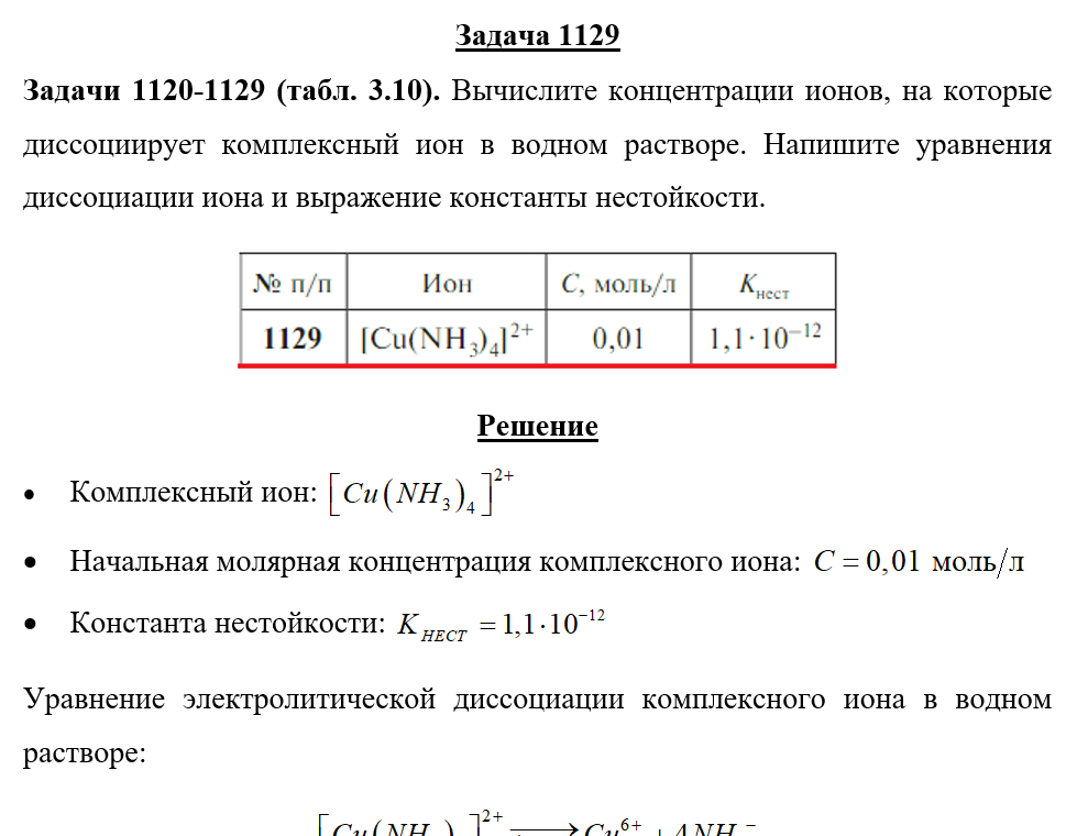 Задачи 1120-1129 (табл. 3.10). Вычислите концентрации ионов, на которые диссоциирует комплексный ион в водном растворе. Напишите уравнения диссоциации иона и выражение константы нестойкости.