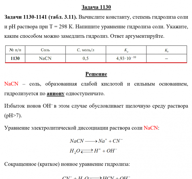 Задачи 1130-1141 (табл. 3.11). Вычислите константу, степень гидролиза соли и рН раствора при Т = 298 К. Напишите уравнение гидролиза соли. Укажите, каким способом можно замедлить гидролиз. Ответ аргументируйте..