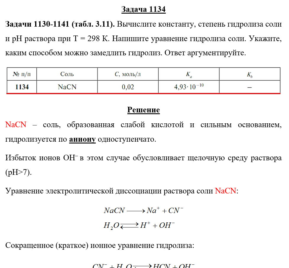 Задачи 1130-1141 (табл. 3.11). Вычислите константу, степень гидролиза соли и рН раствора при Т = 298 К. Напишите уравнение гидролиза соли. Укажите, каким способом можно замедлить гидролиз. Ответ аргументируйте.