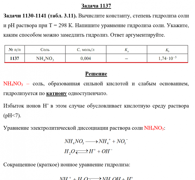 Задача 1137 - Вычислите константу, степень гидролиза соли и рН раствора при Т = 298 К. Напишите уравнение гидролиза соли. Укажите, каким способом можно замедлить гидролиз. Ответ аргументируйте.
