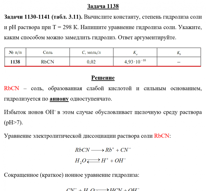 Задача 1138 - Вычислите константу, степень гидролиза соли и рН раствора при Т = 298 К. Напишите уравнение гидролиза соли. Укажите, каким способом можно замедлить гидролиз. Ответ аргументируйте.