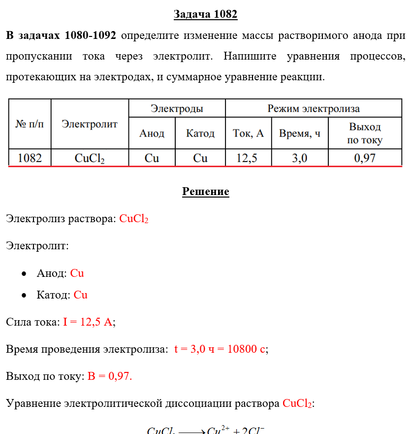 Для студентов по предмету ХимияЗадача 1082 - определите изменение массы растворимого анода при пропускании тока через электролит. Напишите уравнения процессов, протекающих на электрЗадача 1082 - определите изменение массы растворимого анода при пропускании тока через электролит. Напишите уравнения процессов, протекающих на электр