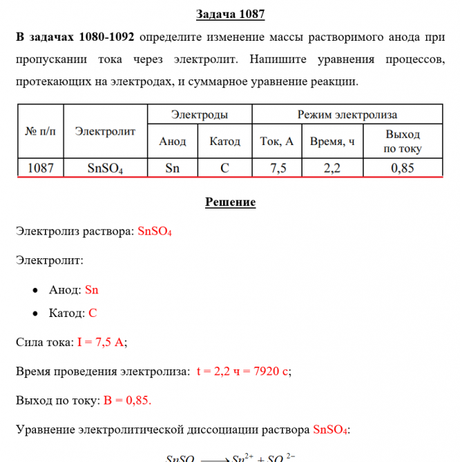 Для студентов по предмету ХимияЗадача 1087 - определите изменение массы растворимого анода при пропускании тока через электролит. Напишите уравнения процессов, протекающих на электрЗадача 1087 - определите изменение массы растворимого анода при пропускании тока через электролит. Напишите уравнения процессов, протекающих на электр