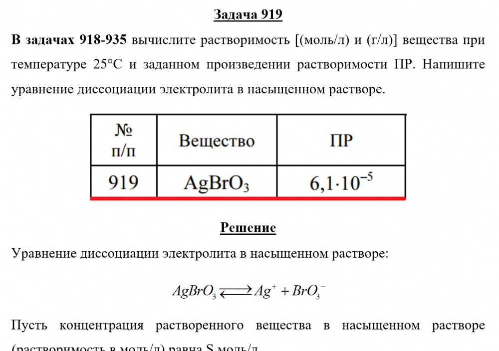 Задача 919 - вычислите растворимость [(моль/л) и (г/л)] вещества при температуре 25 °С и заданном произведении растворимости ПР. Напишите уравнение диссоциации электролита в насыщенном растворе.