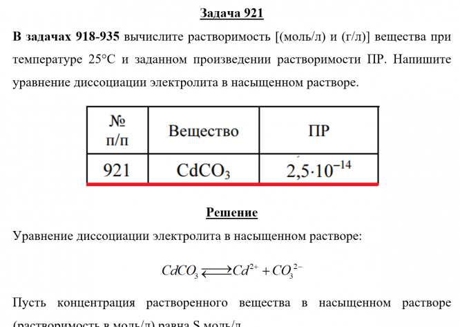 Задача 921 - вычислите растворимость [(моль/л) и (г/л)] вещества при температуре 25 °С и заданном произведении растворимости ПР. Напишите уравнение диссоциации электролита в насыщенном растворе.