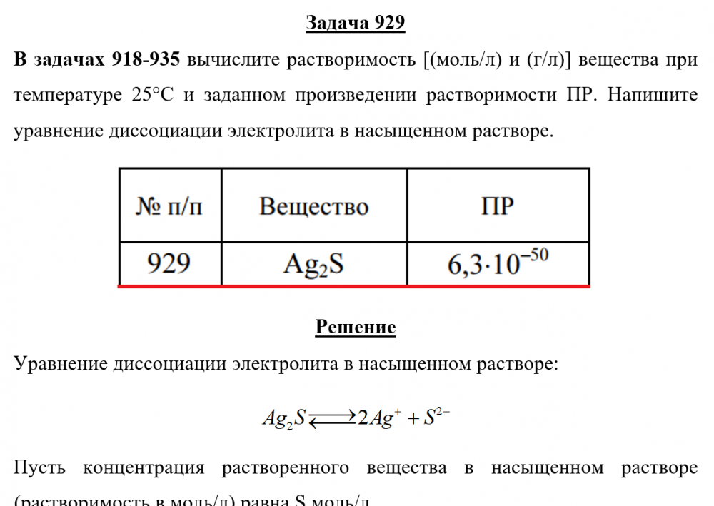 Задача 929 - вычислите растворимость [(моль/л) и (г/л)] вещества при температуре 25 °С и заданном произведении растворимости ПР. Напишите уравнение диссоциации электролита в насыщенном растворе.