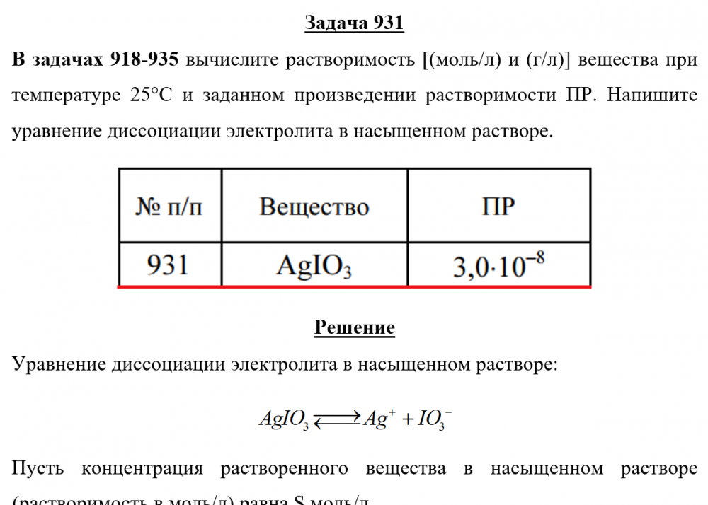 Задача 931 - вычислите растворимость [(моль/л) и (г/л)] вещества при температуре 25 °С и заданном произведении растворимости ПР. Напишите уравнение диссоциации электролита в насыщенном растворе.