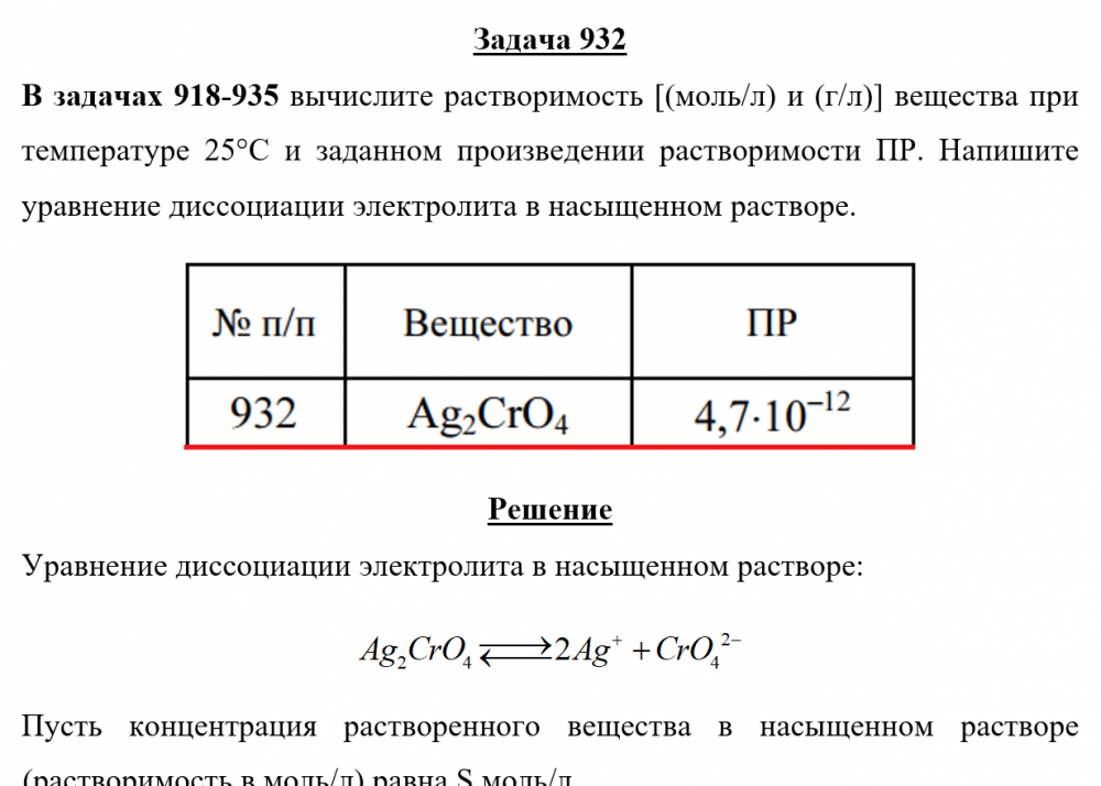 Задача 932 - вычислите растворимость [(моль/л) и (г/л)] вещества при температуре 25 °С и заданном произведении растворимости ПР. Напишите уравнение диссоциации электролита в насыщенном растворе.
