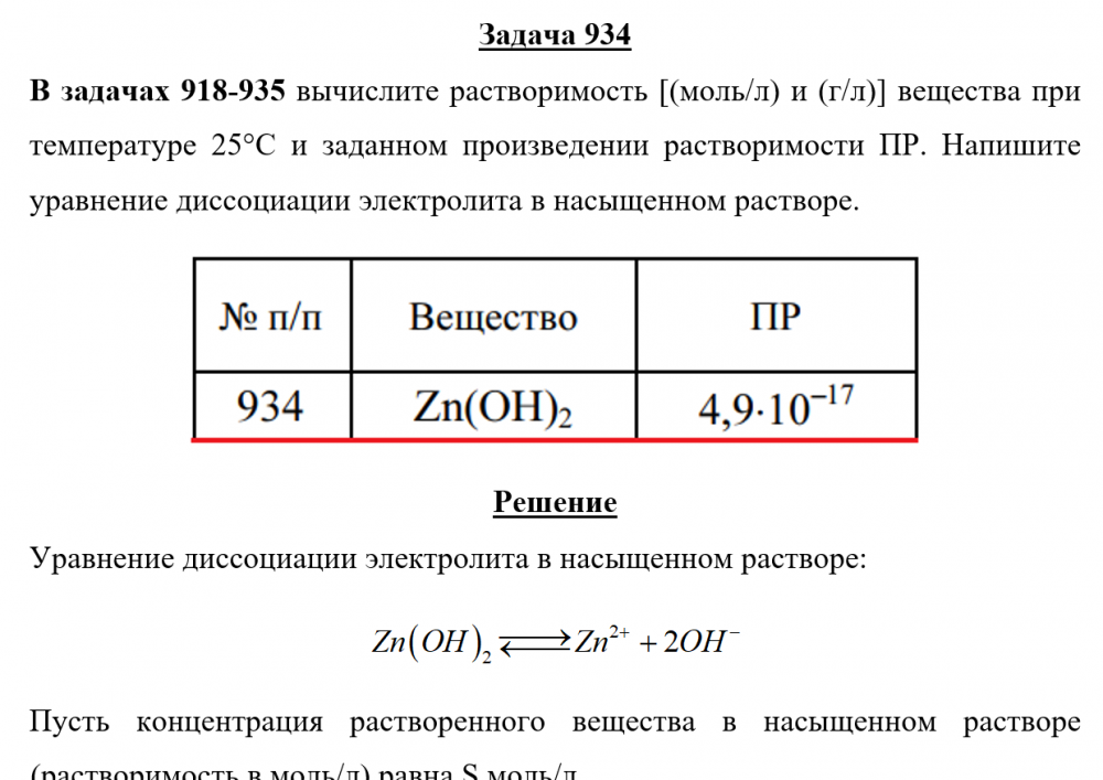 Задача 934 - вычислите растворимость [(моль/л) и (г/л)] вещества при температуре 25 °С и заданном произведении растворимости ПР. Напишите уравнение диссоциации электролита в насыщенном растворе.