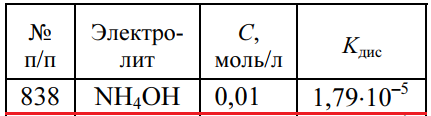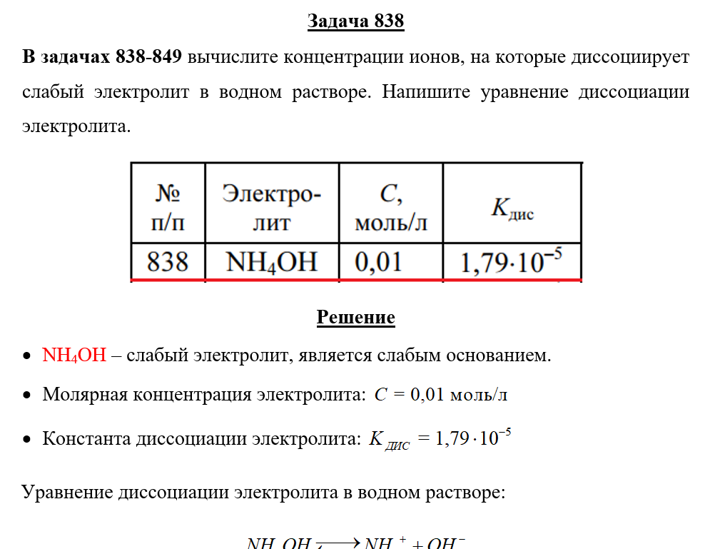 Задача 838 - вычислите концентрации ионов, на которые диссоциирует слабый электролит в водном растворе. Напишите уравнение диссоциации электролит