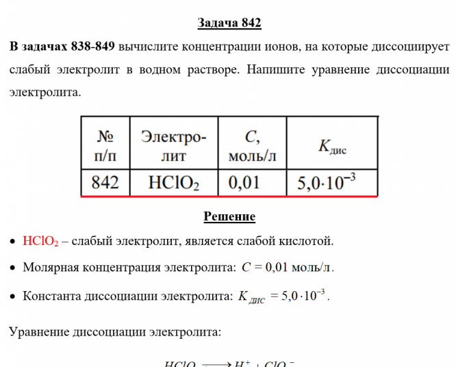 Задача 842 - вычислите концентрации ионов, на которые диссоциирует слабый электролит в водном растворе. Напишите уравнение диссоциации электролит