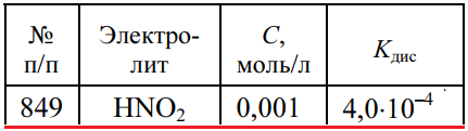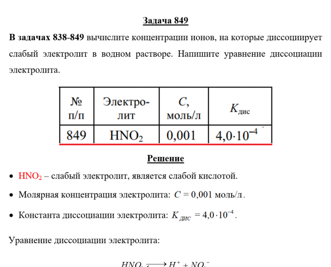 Задача 849 - вычислите концентрации ионов, на которые диссоциирует слабый электролит в водном растворе. Напишите уравнение диссоциации электролит