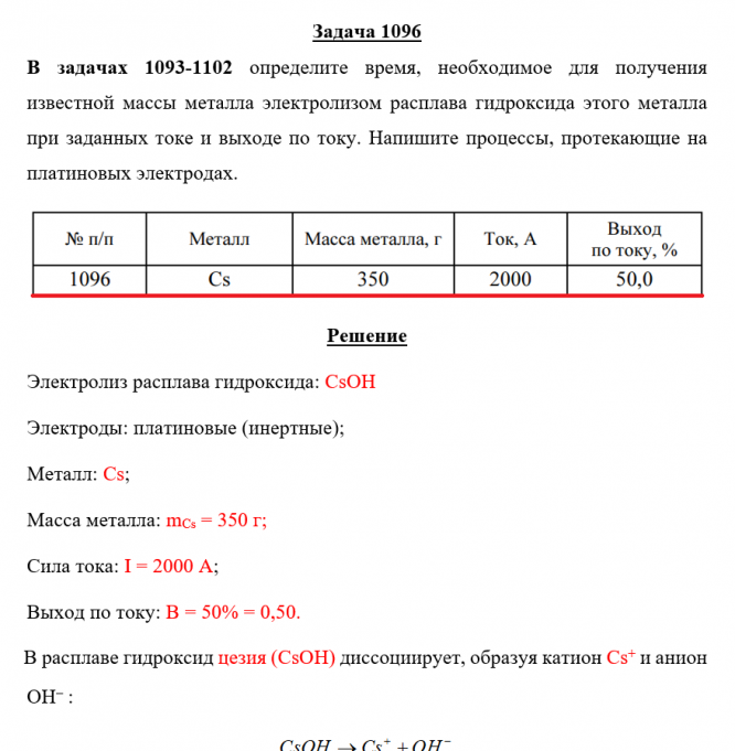 Задача 1096 - определите время, необходимое для получения известной массы металла электролизом расплава гидроксида этого металла при заданных токе и выходе по току. Напишите процессы, протекающие на платиновых электродах.